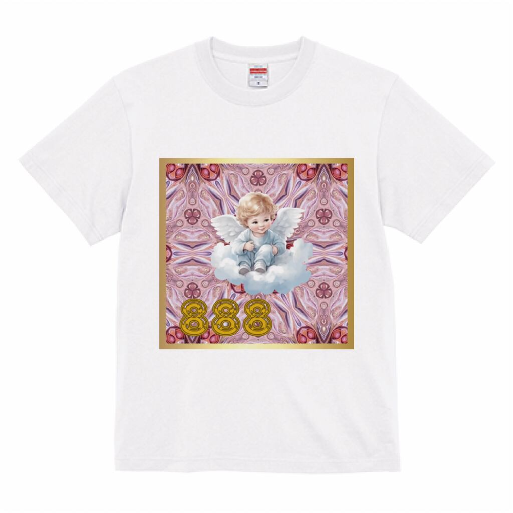 この商品画像は、幸運を招く、Angel Number888と可愛い天使、背景にはrepperで創ったパワフルな幾何学パターンであしらったデザインで、
